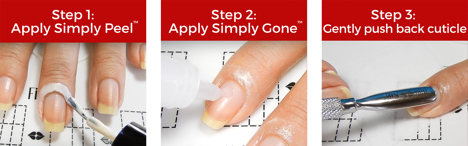 - Using a cuticle removal tool–gently, gently, gently–scrape back and stop right at the proximal fold. Glide the tool against the surface of your nail plate. The Simply Gone™ will have dissolved the cuticle so downward pressure is unnecessary (and too much pressure can bruise your nail plate or cause other damage).